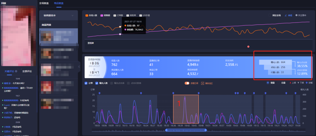 通過【商品分時段復盤】功能,可以發現該直播間在講解時段1和時段2內,講解的都是同一款產品,但是時段2的效果明顯好于時段1,說明時間段2中主播的話術和節奏承接流量的能力更強。