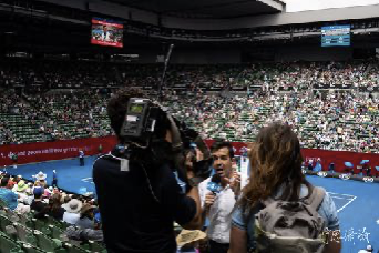這張照片拍攝于某年的澳網賽場,當地的電視臺在進行現場的報到。我離得遠一些的時候拍攝了第一張。然后湊近了又拍攝了第二張。這兩張明顯給了我們不同的代入感。