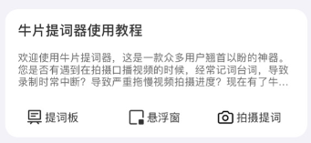 牛片提詞器有提詞板題詞、懸浮窗提詞、拍攝提詞三種模式。我一個一個幫大家介紹: