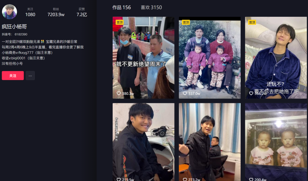 但現在,抖音的個人號粉絲第一位,并不是本身就有流量,人盡皆知的“明星”,而是從抖音本土生態里逐漸殺出來的“瘋狂小楊哥”。