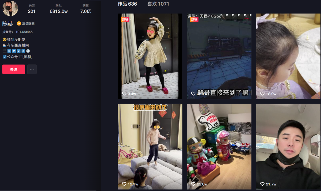 陳赫在抖音的發展有些早期入局者的運氣成分在,相比其他明星,陳赫塑造的人物比觀眾要更低,這也讓普通用戶易于積累對陳赫的好感。但最重要的是,陳赫是抖音技術流的忠實擁躉,并以自己的“愛玩”開辟出了一片天地。
