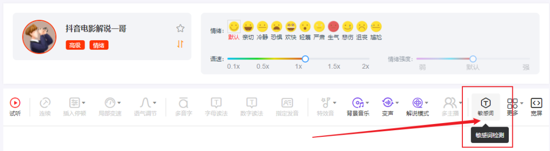 檢測(cè)后的文案,還可以在牛片中一鍵配音,在配音編輯中,也可以直接進(jìn)行敏感詞檢測(cè)。