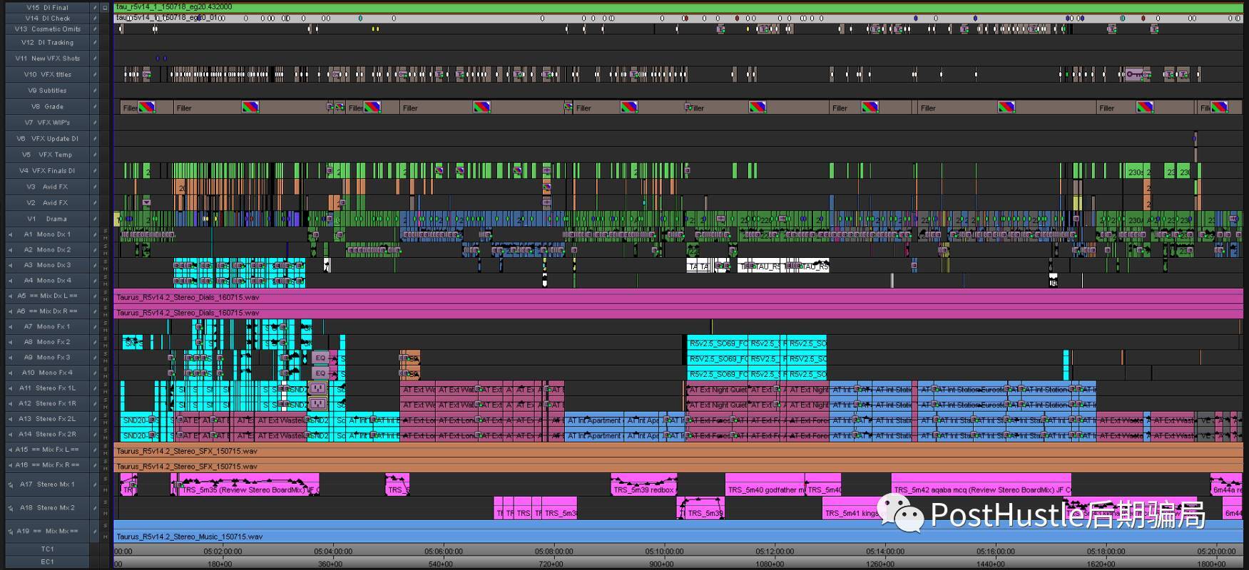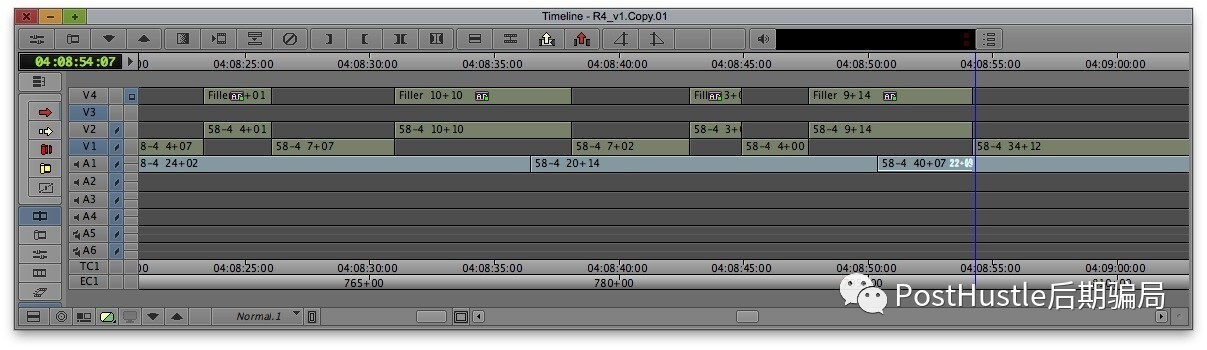 Turnover之前,一定一定一定要整理好自己的時間線!這是剪輯對其他部門的一種尊重。剪輯作為后期素材管理的一大站,需要負起更多的責任。干后期的老說前期坑后期,其實更多時候,是后坑后期!以明確簡單的方式告訴別人接下來要做什么,是起碼的尊重。所以,為了Turnover,一個紛繁復雜的時間線就應該從這樣: