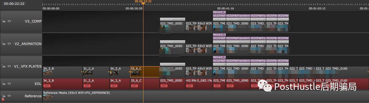 DI公司會把包含需要制作的鏡頭的參考QT、VFX Pull的EDL、鏡頭表,LUT,CDL,DPX序列或者EXR序列(偶爾也會碰到Raw或MOV的)等等發到視效公司。剪輯部門需要做的,是根據這些信息和圖像文件,把一條時間線完整的還原出來。如下圖: