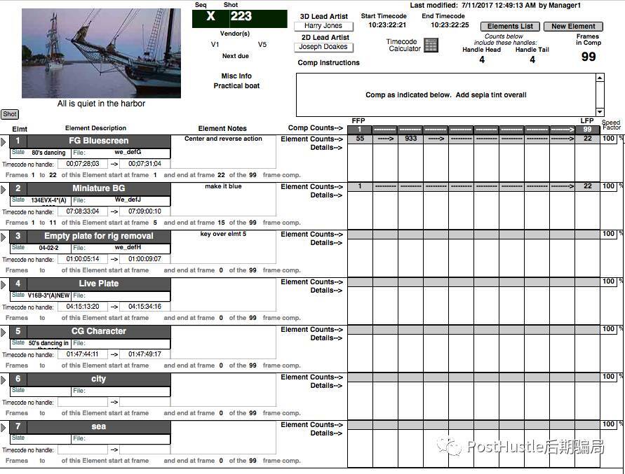 什么是Line-up Sheet呢,舉個簡單的例子。有一個特效鏡頭,內容是籬笆前面一只狗在追著一個女人跑。三個元素,籬笆女人和狗,都是分別拍攝的。那么特效公司怎么知道該用這三個鏡頭的那一段來合成一個完整的和諧畫面呢?Line-up sheet就是做這個用的。這也是我之前為什么說,所有素材都要留在時間線上,這樣你就可以快而準的知道,在預合的時候是怎么安排這三個元素的。