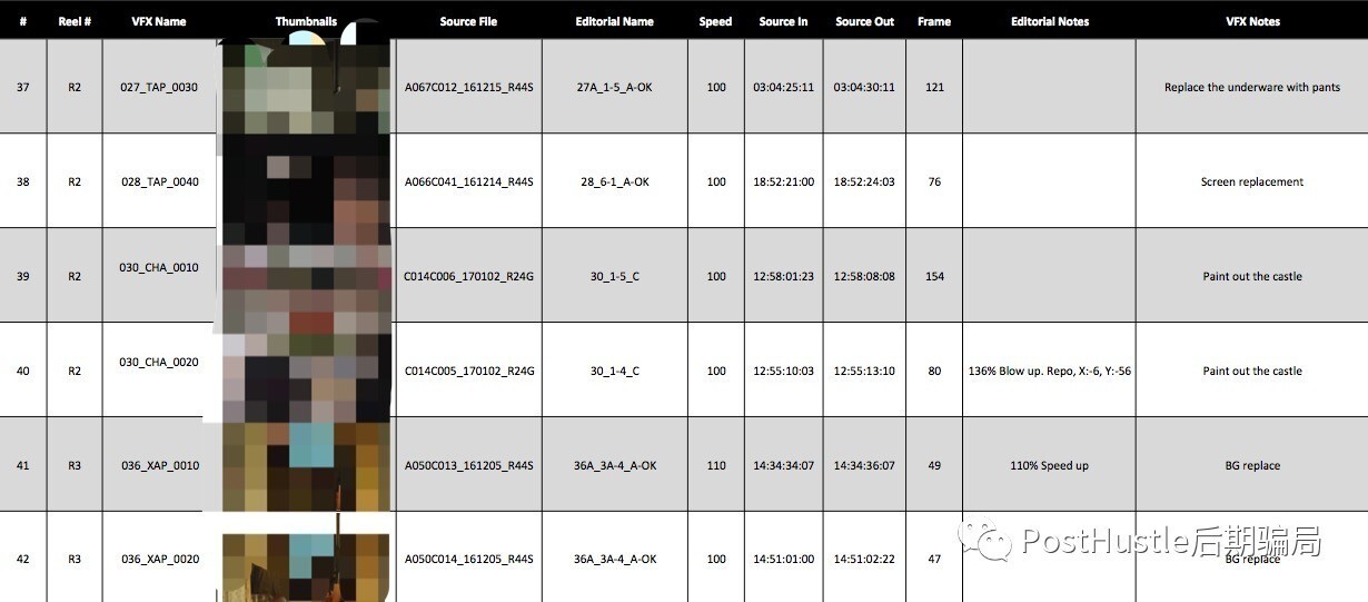 現在,在從Hiero導出的CSV和縮略圖基礎之上,你就可以做一張完整的Shot list了。表格里一般會包括,VFX ID(鏡頭號),縮略圖,起止TC,幀數,原始素材名,剪輯名,Optical信息(位移,縮放,變速等),以及VFX制作描述。 如下圖示意: