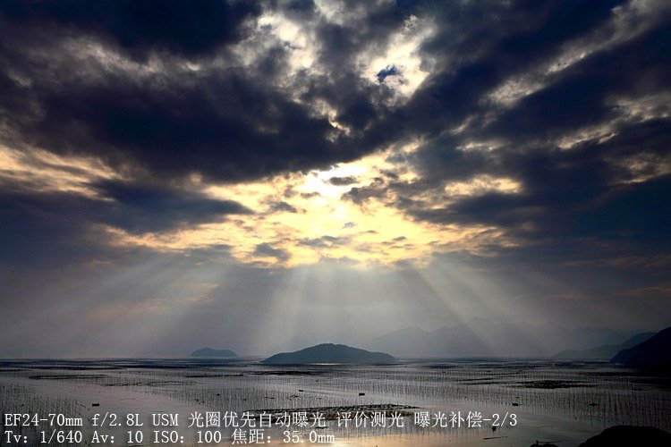 這張片子,是臺風(fēng)后所拍,臺風(fēng)剛過,天上的云彩很是特別。我使用平均測光,因為當時天上的云層很厚,下方有漁火,所以不用加任何濾鏡,有的時候,天氣就是一個天然的濾鏡。因為要保證曝光時間足夠,ISO相對提高到了400和用到了大光圈5.6。焦段選擇了24MM廣角端,采用了三分構(gòu)圖,天空點了三分之二,地面占了三分之一,并在后期裁剪成方形。之所以裁剪為方形,因為兩邊的山避讓不開,后期適當加了對比,其他不變。