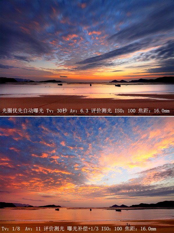 這兩張片子都是在同一地點,同一機位所拍。中間僅僅相差了五分鐘,因為云彩不同,出的兩張片子也不同。第一張30秒的曝光時間,用了黑卡技術(shù)壓暗天空。第二張,加了三檔漸變灰濾鏡,適當加曝一檔,讓水面曝光更加充分。其實這兩張片子我只是調(diào)整了不同的光圈,第一張因為為了曝光正常,所以用了大光圈,因為當時光線較暗,第二張用了小光圈,盡可能的保留細節(jié)。同樣采用了三分構(gòu)圖方式,天空占了三分之二。后期在DPP里面加了對比與飽和度。飽和度加得很少,因為當時的色彩已經(jīng)很濃烈。