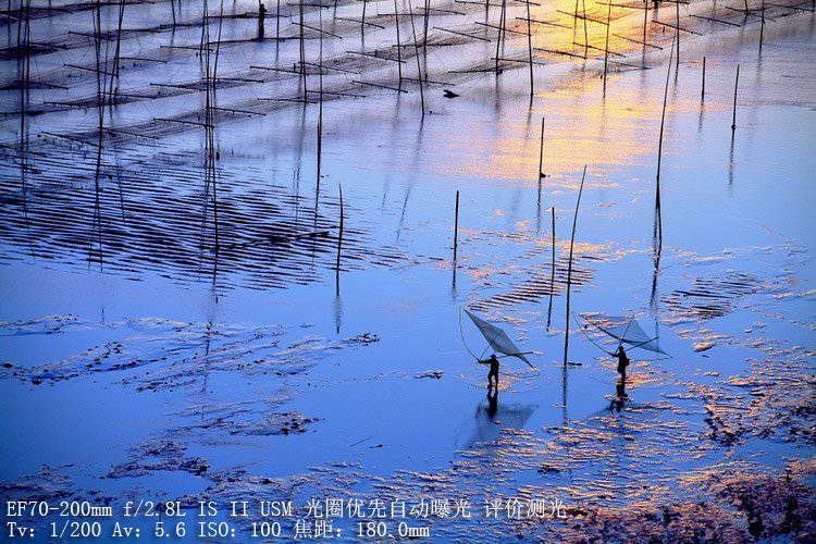 正逆光拍攝,平均測光,因為有人在運動,一定要保證適當?shù)目扉T速度,所以光圈適當加大。運用了對角線構(gòu)圖,人與紫菜架子的相互呼應(yīng),使畫面平衡。在后期方面,適當拉低了色溫,使整體色調(diào)偏藍,藍色調(diào)與太陽射下那一縷金色調(diào)相交映,營造出一幅美麗的畫面。前提條件是拍攝時候用RAW格式,而且色溫不能過低,過低會造成色彩溢出。