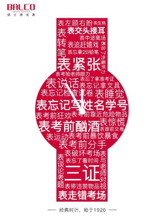 再比如:腕表行業(yè)為數(shù)不多能在高考營銷戰(zhàn)中嶄露頭角的品牌“瑞士拜戈”,海報主體用文字填充出一只表。文案中反復(fù)使用網(wǎng)絡(luò)用語“表(不要)”,把考前高考生需要注意的事情進(jìn)行羅列和善意提醒。既表現(xiàn)出創(chuàng)意,又和產(chǎn)品形成關(guān)聯(lián)。
