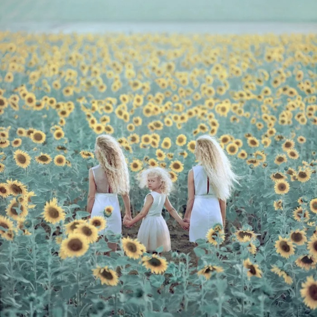 左右兩邊的女孩作為陪體,和周圍的向日葵一同構成重復的元素。
