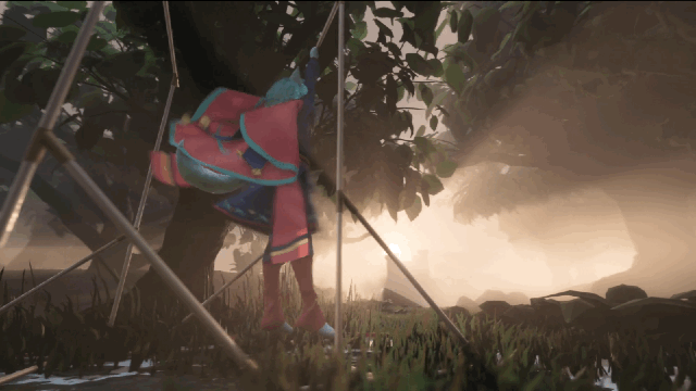 現(xiàn)場拍攝的道具包括一組現(xiàn)成的1-1/4"硬件平行高桿作為“搖擺樹”,就是Princess Catgirl拽著蕩啊蕩的那個,在現(xiàn)場拍攝時是真實存在的。藝術(shù)家根據(jù)實物進(jìn)行3D復(fù)制并建模,在渲染中準(zhǔn)確定位舞臺中的樹枝裝置以及蘋果箱的位置,保證3D環(huán)境渲染與現(xiàn)場匹配。