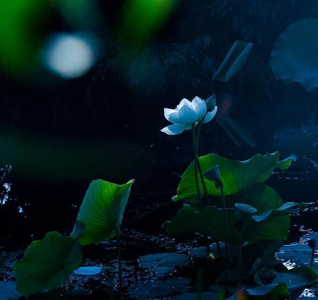在月光下拍攝荷花依舊美麗,天空中月亮倒影在水中伴隨著荷花,現實的存在永如夢幻般難以觸及,唯留現實與夢幻隨風飄蕩。