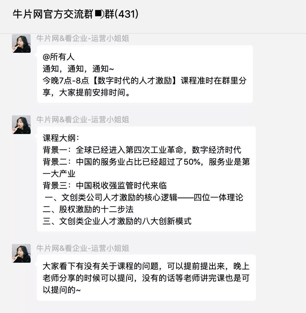 2月12日晚,牛片官方社群為用戶組織了在線學習課程,課程內容為“數字時代的人才激勵”,我們邀請到了知名律師事務所的老師,為群內眾多影視公司分享文創產業如何對員工進行股權激勵。
