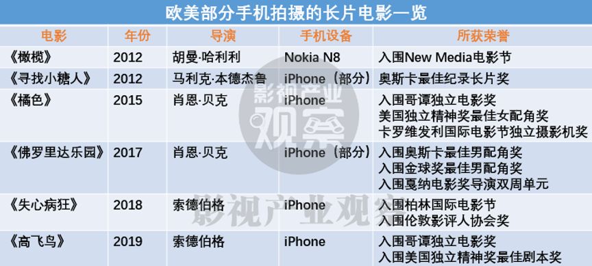 2010年,蘋果公司發布了iPhone 4,這是全球首款可以拍攝720p高清視頻的智能手機,隨著這一在攝像上具有跨時代意義的手機的誕生,那些精通智能設備且預算有限的電影人很快涉足手機電影領域。如果說10年前用手機設備拍攝電影的做法在業界還被看作是一種噱頭,在iPhone4誕生后,這一看法則被逐漸推翻,現在,不僅普通觀眾和影迷會拿起手中的iPhone創作視頻,不少電影界的知名導演都開始用手機拍攝電影。甚至,自2012年以來,不少國際電影節和知名獎項上都出現了用手機器材拍攝的電影,其中更有影片最終拿下了奧斯卡大獎。