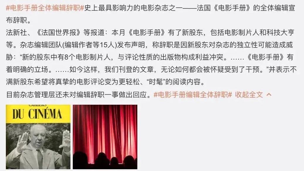 據法新社、《法國世界報》等媒體報道,史上最具影響力的電影雜志之一——法國《電影手冊》以斯蒂芬·德洛姆(Stéphane Delorme)為首的手冊編輯部15名成員宣布全部辭職。
