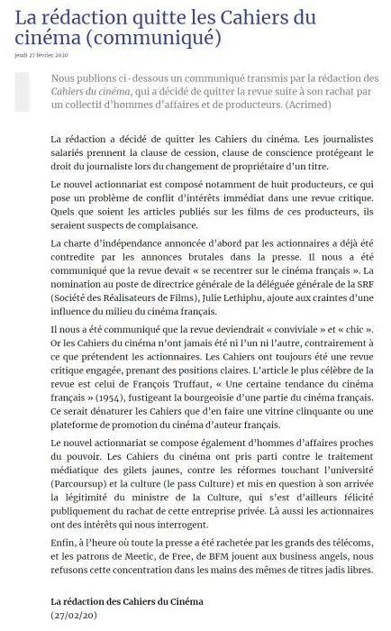 這是《電影手冊》歷史上第一次編輯部全員離職,原因是新股東對雜志的獨立性可能造成威脅。辭職聲明中指出,新股東成員包含八名制片人,對以批評為主的雜志造成了明顯利益沖突,同時編輯部被告知,應當“重新聚焦法國電影”,以及更“友善”以及更“時髦”。因拒絕雜志被裝點成鼓吹法國作者電影的浮夸櫥窗和推銷平臺,以及未來發表任何關于這些制片人股東的電影評論都難脫諂媚的嫌疑,《電影手冊》的編輯部于法國當地時間2月27日,發布全體辭職聲明。目前《電影雜志》管理層還未對編輯辭職一事做出回應。早在本月初,據AlloCiné報道,這本法國老牌電影雜志被20位電影界的影迷聯合收購,并成立名為“手冊之友”的公司。同時,éric Lenoir將擔任《電影手冊》的經理人與指導。《電影手冊》的新管理團隊還表示,之后雜志將增加電子版,以及開設"大師班"播客等等有關新媒體的內容。今年一月份,《電影手冊》公布了2019年度的十佳片單,其中獲得戛納金棕櫚獎和奧斯卡最佳影片獎的《寄生蟲》、獲得威尼斯金獅獎的《小丑》和獲得柏林金熊獎的《同義詞》均有入圍。《電影手冊》是法國影評人安德烈·巴贊等人創辦于1951年4月,意欲通過電影批評來引導、教育大眾接受藝術與美的熏陶。巴贊決心成為一名真正的電影評論家,僅在手冊上就發表過116篇文章,同時也不遺余力在各地組織活動,推廣電影。1958年巴贊去世以后,《電影手冊》被交到一群年輕編輯手上:讓-呂克·戈達爾、弗朗索瓦·特呂弗、克勞德·夏布洛爾、雅克·里維特……《電影手冊》素來是一本高度介入、表明立場的批判性雜志。其最著名的評論當屬弗朗索瓦·特呂弗的《法國電影的某種趨勢》(1954),抨擊了法國電影的部分資產階級,實際成為法國新浪潮運動的理論宣言。幾年后,他拍出了驚世處女作《四百擊》。影評人們紛紛轉向創作,形成知行合一的獨特風潮,成為世界影史影響最深遠的一次美學運動。早期《電影手冊》就有主張獨立電影、激進政治的傾向。五月風暴前后,特呂弗、戈達爾發起抗爭運動,欲改變法國電影工業樣貌,《電影手冊》成為后援基地;1970年代取消主編,進入集體創作時代;受當時中國的影響,手冊日益意識形態化,內部還曾成立過“革命文化戰線”及“魯迅小組”。直到今天,《電影手冊》仍不愿隨波逐流,保持著鮮明立場,每年的關于年度電影的十佳評選,都成為了觀眾選擇、觀看電影的重要依據。《電影手冊》仍致力于在全世界搜尋和挖掘有才華的導演。“年度十佳電影”是《電影手冊》每年的重頭戲,上榜的影片豐富、類型多樣。筆者介紹的十年百部佳片就是匯集了《電影手冊》10年來評出來的作品。在其中每部電影資料詳細,導演生平和劇情、影評、主演、獲得獎項、劇照,這些令讀者對影片有了相當的印象。這本冊子對專業人士而言可作為參考“資料”收藏,對于影迷而言是不錯電影指南。至少可以了解法國電影人是以何種視角觀察世界電影。《電影手冊》常設的欄目主要有“作者研究”、“影片分析”、“導演訪談”,以及對許多不同的民族國家電影所做的深度報道。“作者研究”是該雜志以每期一個重點人物的形式推出的,這些人物不但有電影史中已成經典的大師,比如費里尼、伯格曼、帕索里尼等人,也有為新近去世的大師推出的紀念專輯,比如庫布里克和布萊松專題;同時還有對正在創作的電影導演進行的專題性回顧,比如阿莫多瓦專題,或是北野武專題。進入這個欄目的作者既有以拍攝藝術片而確立自己地位的電影家,也有在好萊塢商業電影領域中獨領風騷的電影導演,比如吳宇森。“影片分析”欄目的重點是針對重要導演的新作進行評析。影評家對電影史上一些重要影片所撰寫的重要評述文章,很多都來自這個部分。比如對《筋疲力盡》、《媽媽和妓女》的介紹,都曾引起極大反響。該欄目也對電影史中的一些經典之作進行回顧式的評介,比如對雷諾阿影片的介紹,我們幾乎在每個時期的《電影手冊》中都可以看到。“導演訪談”是對正在拍攝新片的重要導演作現場采訪。在其中我們經常可以看到馬丁-斯柯塞斯、伍迪-艾倫、阿蘭-帕克、王家衛等人的面孔,而他們的肖像也會經常出現在該期雜志的封面上。1999年12月,《電影手冊》雜志現任主編夏爾-戴松來到北京,帶來了與這本雜志的發展歷史密切相關的幾部電影作品,在北京電影學院進行了名為“《電影手冊》雜志周”的專題放映,引起很大反響。而此前,他們還在上海調查中國電影狀況,并將成果發表在《電影手冊》題為“中國國產”的專輯上。他們對中國新生代導演的創作也表現出極大的興趣,同時對港臺電影也多有介紹。歷經70年,《電影手冊》催生了法國電影新浪潮運動(1958~1964),發掘了大量的電影新導演,以其鮮明批評方針,不妥協敢言的姿態,在當今電影屆獨樹一幟,在歐美及至世界影壇都有深遠的影響力。而它與中國電影界的關系似乎才剛剛建立起來。如果說我們以前對法國電影只能是“遙望”,那么今天,我們也許有機緣對此前我們一直陌生的東西認真地“近觀”。這帶給我們的,無疑是欣喜。而全體編輯辭職這件事不僅將終結《電影手冊》自2009年開啟的德洛姆時代,甚至可能引發這本全球首屈一指的電影雜志歷史上最大危機。這也意味著這群資歷深厚的老編輯