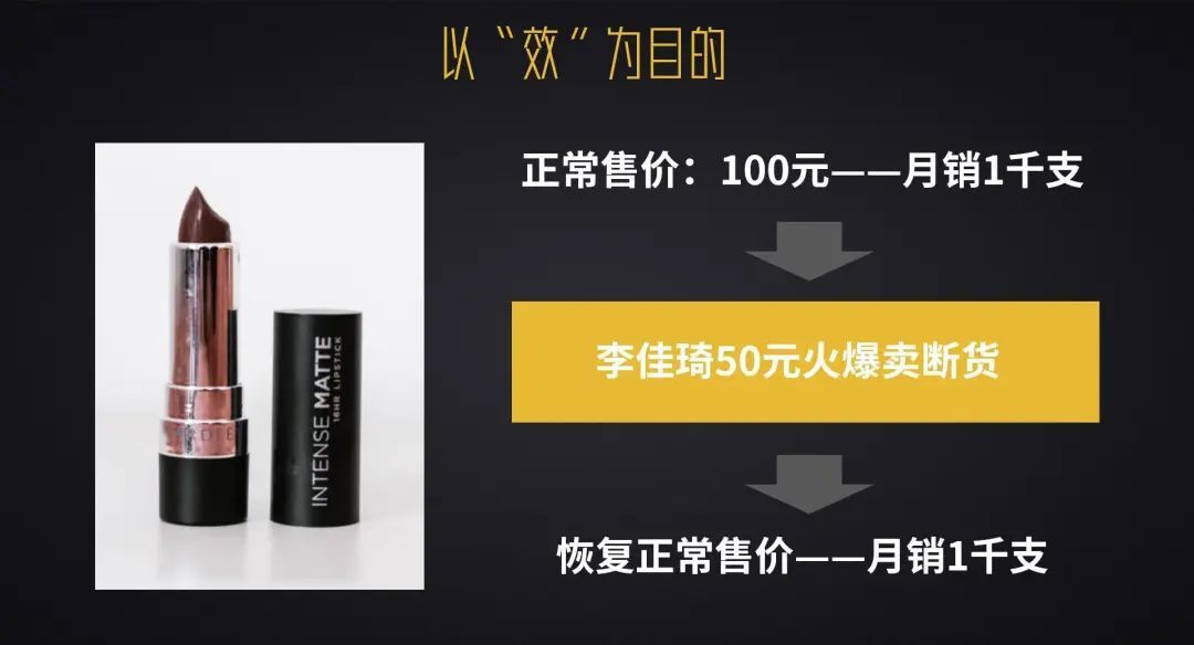 設(shè)想:如果一款口紅平時(shí)賣100元,李佳琦一次直播間,虧本50元賣斷貨。如果以直播間的“效”為目的,那他下一次還想大賣,是不是還必須再去找李佳琦?(且必須還賣50元)這樣的虧本生意老板干它圖什么呢?
