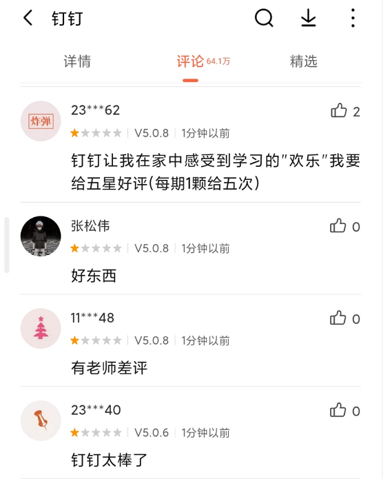 由于釘釘APP的網課功能的恐怖性強大,被孩子們抓住猛打差評。