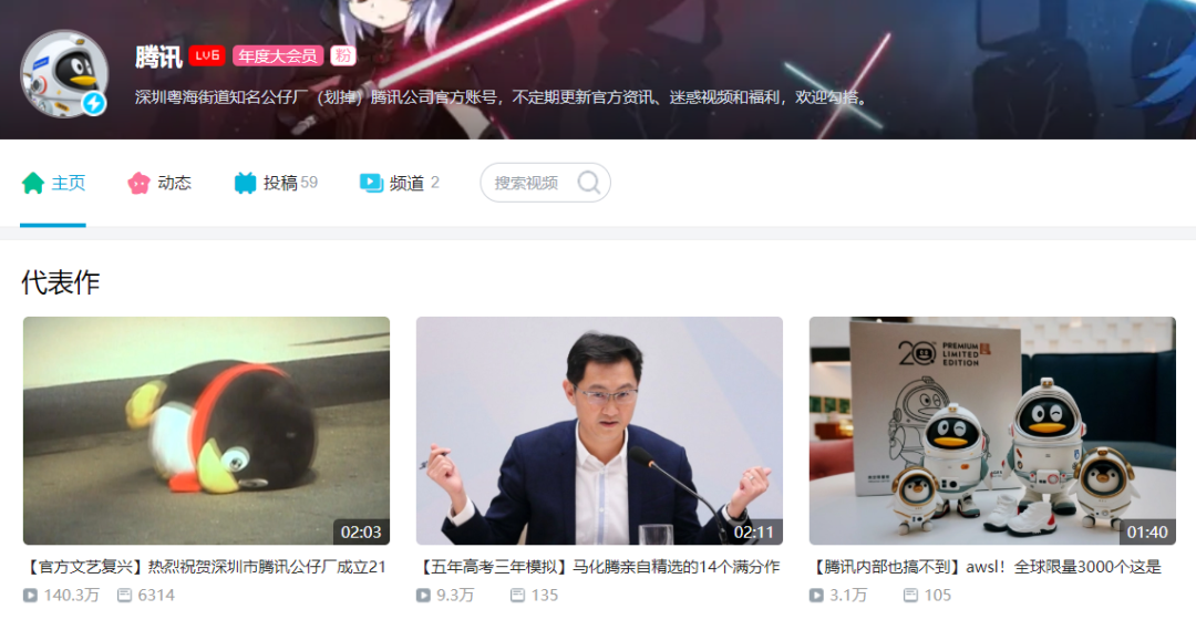深諳其道的當然少不了騰訊。正常思維下,騰訊開通B站官方賬號,至少應該給自己一個“國內知名互聯網公司”的頭銜吧?