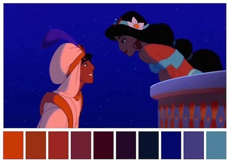上圖男主的白色衣服給人光明、純真、希望的感覺,女主藍色的衣服給人溫柔、高潔、清麗的感覺。大面積的藍紫色背景透出神秘與浪漫的氣氛。在昏黃燈光的照射下人物呈現偏暖的顏色又給人熱情似火、整體色彩的搭配透出神秘和夢幻,仿佛置身其中,美夢成真不愿醒來!