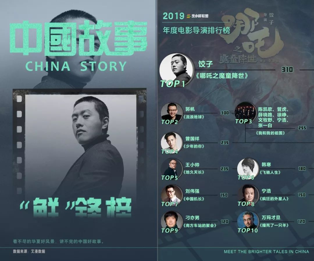 2019年度國產(chǎn)電影導(dǎo)演排行榜“時至今日,天地反復(fù),一眾新銳導(dǎo)演生龍活虎,摧營拔寨,屢創(chuàng)新高,一部影片動輒已是20億起步,不過30億都不好意思慶功。看著團隊搞出的這個一億的大紅海報,不禁感慨,英雄老矣。”馮小剛在自己年末上映的《只有蕓知道》票房破億時在微博這樣感慨道。的確,18年以文牧野、饒曉志為代表的新生代導(dǎo)演便憑借處女作一鳴驚人,讓行業(yè)和觀眾開始關(guān)注到新導(dǎo)演不可小覷的生猛力量。到了19年,多達十幾位新導(dǎo)演以全新的視角、態(tài)度、敘事手法和時代精神,向觀眾呈現(xiàn)出一個個眼前一亮的故事,不僅得到了業(yè)內(nèi)的認可與好評,其中更不乏口碑與票房雙豐收的佼佼者,為華語電影注入了新的生機與活力,帶領(lǐng)華語電影走上了新的高峰。春節(jié)檔的《流浪地球》,作為唯一一部科幻片,在春節(jié)檔一眾大咖云集、題材優(yōu)勢明顯的喜劇片中突出重圍,以20億成為春節(jié)檔票房冠軍,并以總票房46.8億的成績成為中國影史總票房第二名。這樣一部現(xiàn)象級作品背后,80后、非科班出身的導(dǎo)演郭帆,一時間成為19年上半年最受矚目的導(dǎo)演新面孔。《流浪地球》之前,雖然還執(zhí)導(dǎo)過處女作《李獻計歷險記》和票房成績優(yōu)秀的青春片《同桌的你》,“科幻迷”郭帆心心念的,卻是拍攝一部中國科幻電影。15年被中影委以重任的他,用四年時間證明了自己的野心。憑借腦洞大開的想象力、比肩國際的視覺特效、中國特色的人文情懷和對人性的深度挖掘,《流浪地球》填補了中國科幻電影的空白,被稱“打開了國產(chǎn)科幻片的大門”。2020年新年伊始,郭帆也透露《流浪地球2》即將開拍。看來郭帆的“科幻夢”,要一直做下去。《流浪地球》剛坐穩(wěn)中國影史票房亞軍的位置沒多久,就被暑期檔動畫電影《哪吒之魔童降世》擠至季軍。這部“橫空出世”的動畫電影不僅登頂2019年票房榜,還幾乎刷新了所有國產(chǎn)動畫電影的紀錄,創(chuàng)造了國產(chǎn)動畫電影新的高峰。巧合的是,和郭帆籌備《流浪地球》一樣,從15年開始“死磕”了四年,支撐導(dǎo)演餃子的,同樣是對國產(chǎn)動畫電影的熱愛和信心。因為熱愛,餃子從學(xué)醫(yī)轉(zhuǎn)行做動畫,見證了中國動畫產(chǎn)業(yè)從蕭條到重生的過程。在餃子身上,我們也看到了處女作導(dǎo)演對作品的專注和堅持。《哪吒之魔童降世》中打破成見的人物形象和“我命由我不由天”的時代精神,也是導(dǎo)演兼編劇的餃子最好的個人寫照。除了餃子、郭帆這兩位站在19年電影市場票房頂端的新導(dǎo)演,縱覽19年的國產(chǎn)片票房榜和口碑榜,新銳導(dǎo)演的貢獻有目共睹,當之無愧地撐起半邊天——講述不一樣的青春成長故事的《少年的你》和《過春天》背后,是香港導(dǎo)演新面孔曾國祥和受到國內(nèi)外各大電影節(jié)肯定的處女作導(dǎo)演白雪;年末賀歲檔“黑馬”《誤殺》,是剪輯高手柯汶利的導(dǎo)演處女作。此外,票房成績不俗的愛情片《最好的我們》導(dǎo)演章笛沙、寧浩“壞猴子”計劃《受益人》導(dǎo)演申奧、黃渤HB+U計劃《被光抓走的人》導(dǎo)演董潤年...... 這些新面孔為中國電影帶來的題材、內(nèi)容、類型、視角多元化,可以說是19年中國電影市場的最大驚喜。19年不只香港電影穩(wěn)扎穩(wěn)打、再創(chuàng)票房佳績,香港導(dǎo)演的北上業(yè)績,同樣可圈可點。2017年,一部《七月與安生》誕生兩位金馬影后,影片導(dǎo)演曾國祥也進入內(nèi)地觀眾視野。常被人稱作新人導(dǎo)演的曾國祥,至今其實已經(jīng)拍了10年7部電影,但在《七月與安生》前,成績并不出眾,人們提起他,第一反應(yīng)仍是“曾志偉的兒子”。然而在陳可辛的指導(dǎo)下,曾國祥顯然找到了把自我表達和市場表現(xiàn)相結(jié)合的表達方式。十月改檔上映的《少年的你》,將校園霸凌、少年犯罪、高考等社會現(xiàn)實問題融入青春類型片,不僅讓易烊千璽完成了從流量到演員的完美蛻變,電影帶來的對校園霸凌現(xiàn)象的關(guān)注,更使其多了深層的社會意義。內(nèi)地觀眾熟悉的香港導(dǎo)演里,已經(jīng)有了曾國祥的名字。17年就曾拍攝獻禮片《建軍大業(yè)》的香港導(dǎo)演劉偉強,時隔兩年又再次接到了博納“中國驕傲”三部曲的終章《中國機長》的拍攝重任。攝影師出身,見證過九十年代香港電影的黃金時代,拍出過《古惑仔》《無間道》等系列電影,敏銳的市場嗅覺,也讓他成為最早“北上”內(nèi)地拍片的香港導(dǎo)演之一。拍攝根據(jù)真實事件改編的《中國機長》,故事結(jié)局已經(jīng)毫無懸念。劉偉強一方面從飛機特效、民航服務(wù)、人物塑造方面最大程度還原原型,增強電影真實感,一方面對故事進行藝術(shù)加工,全方位塑造立體空間內(nèi)的緊張感,完成了對主旋律題材電影商業(yè)化的又一次成功嘗試,實現(xiàn)了票房口碑的雙豐收。而除了曾國祥、劉偉強這兩位進入TOP10的香港導(dǎo)演,《葉問4》導(dǎo)演葉偉信、《烈火英雄》導(dǎo)演陳國輝的影片也紛紛進入年度國產(chǎn)電影票房榜TOP20,交出了優(yōu)異的“北上成績單”。喜劇+商業(yè),同類型導(dǎo)演中的佼佼者