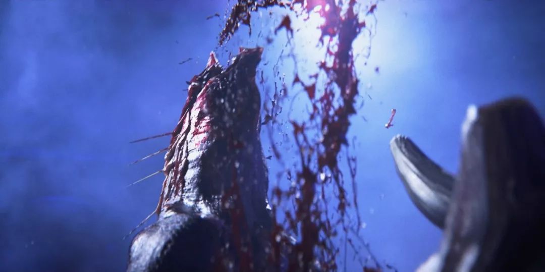 另一個是《變形者》里狼頭在鏡頭前被咬,困難點在毛發和血液離鏡頭太近,一點點瑕疵都不能有,渲染方面要求也很高,毛發在鏡頭里的景深效果只能在 3D 里面做,這非常吃渲染的時間,所以容錯率非常低。