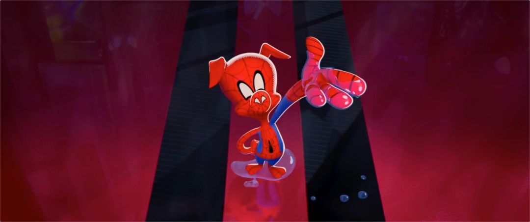 蜘豬俠則呈現出我們以前在《兔八哥》和《貓和老鼠》等滑稽動畫中常見的卡通表演方式,比如這個握手的動作,你可以看到角色的姿態呈現出非常有卡通感的曲線,以及他伸手的動作,都非常有卡通感。