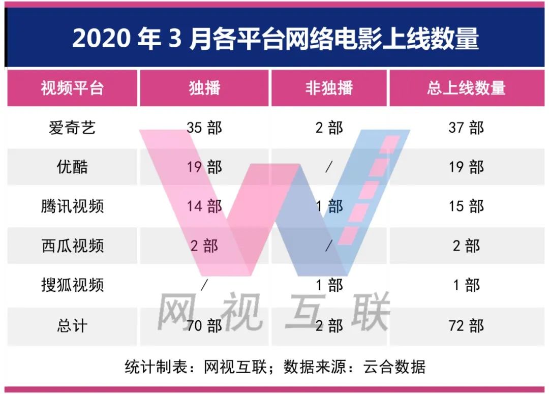 據云合數據,3月份愛奇藝、優酷、騰訊視頻、搜狐視頻、西瓜視頻共上線網絡電影共計72部。從數量上來說,創造了2019年6月份以來的最高記錄。
