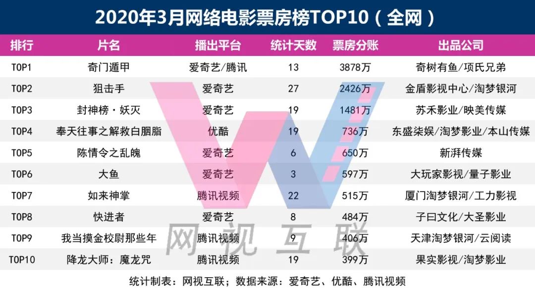 網視互聯(ID:wxs360)在剔除掉舊片、累計票房之后,整理出了3月份全網網絡電影票房分賬榜TOP10。