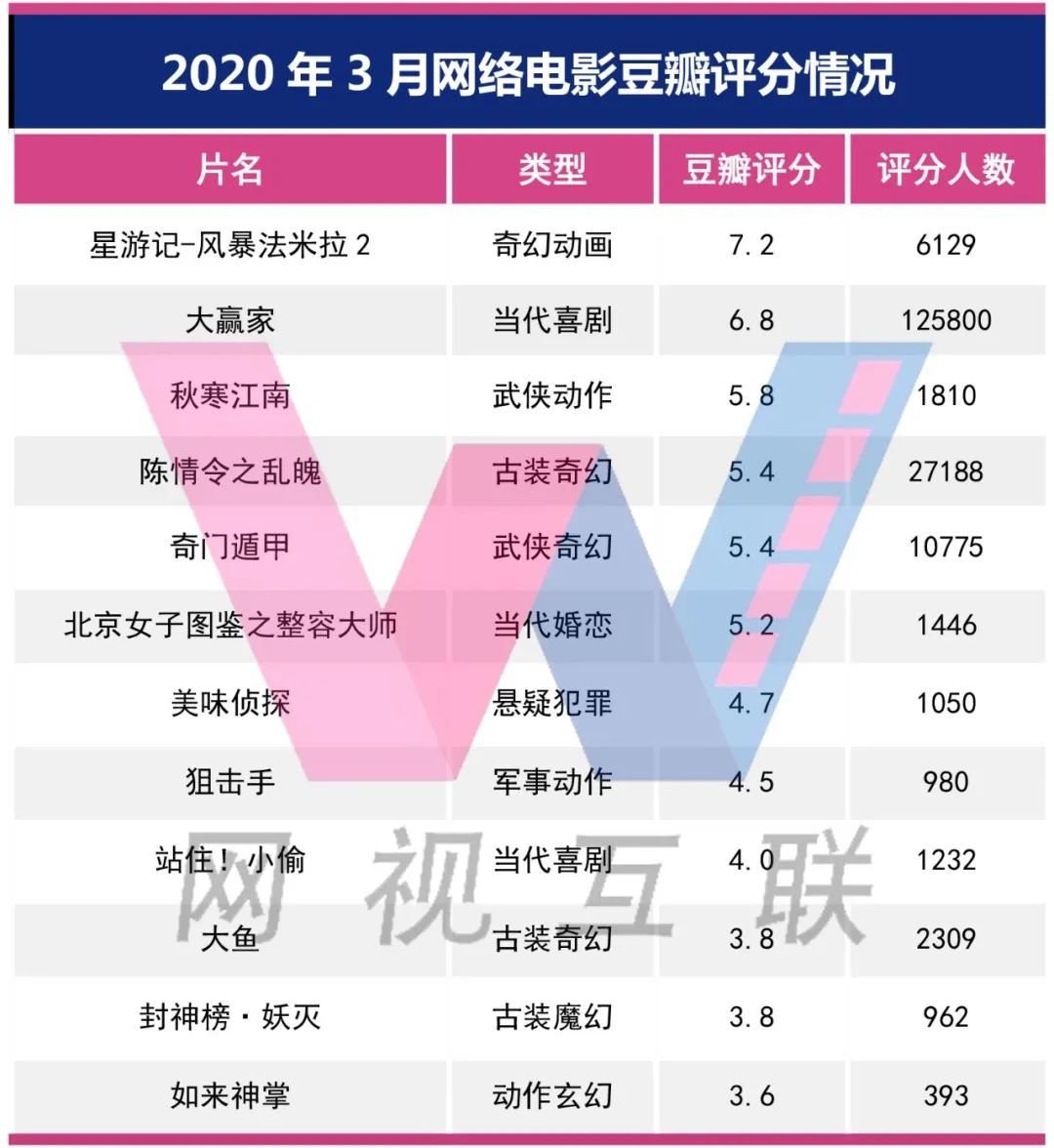 而3月份豆瓣評分5分以上網大明顯增多,評分人數超過1000的影片更是達到了11部,甚至1個月出現了2部評分人數破萬的影片。
