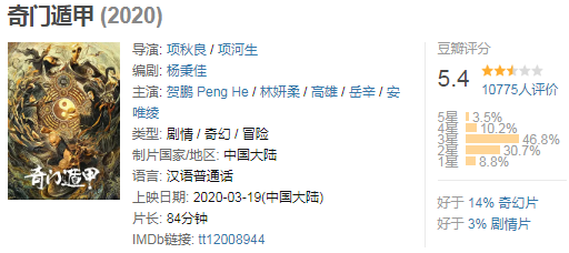 其中票房冠軍《奇門遁甲》豆瓣評分雖然只有5.4,但評價人數突破了1萬+。而作為爆款網劇《陳情令》的番外篇,《陳情令之亂魄》豆瓣評分也同樣5.4,但評分人數高達27188人。這樣的熱度在網絡電影里并不多見。
