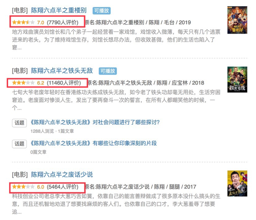 原生內容與IP改編作為網絡電影重要的創作方式,二者幾乎對半分。其中原生內容經過發展也不再是“一錘子買賣”,為了保證內容的存續發展,系列化已成常態,10部網大,至少5部片名中帶著“之”字。《二龍湖浩哥》系列從2012年推出,至今已經8部;《大蛇》第一部獲得了5000萬票房記錄,如今第三部正在籌備中;《陳翔六點半》系列網絡電影至今已3部,票房都在千萬以上,且最高口碑達到了豆瓣7.0分。這讓我們看到原生IP的巨大潛力,與單部影片相比,系列化網絡電影爆發力更強、影響力更久,用戶粘性更高。在所有原生內容的系列化項目中,《陳翔六點半》非常典型。導演陳翔帶著自己的團隊,通過短視頻積累了一定粉絲之后,沿著“短視頻-網絡電影-院線電影”的道路一路進軍。從2017年推出第一部網絡電影至今,其推出3部作品,每一部作品都表現良好。可以說“陳翔六點半”用3年的時間為這個經典IP注入厚度和寬度,實現了短視頻IP的升級,并且還在不斷擴大和加固。《陳翔六點半之廢話少說》 2017年4月 分賬票房1239.2萬《陳翔六點半之鐵頭無敵》 2018年6月 分賬票房 2371.9萬《陳翔六點半之重樓別》 2019年7月 分賬票房 1858萬接下來,我們將解析“陳翔六點半”這個IP從短視頻實現一生二,二生三,延續出如此多形態網生內容的方法論。拍網絡大電影之前,“陳翔六點半”以短視頻形式風靡于網絡,早已是短視頻領域的知名IP。2014年,陳翔辭掉了在大家看來穩定而體面的電視臺工作,一頭扎進短視頻創業中。2015年初,上線了《陳翔六點半》第一支視頻,陳翔算是短視頻領域較早的入局者,在2017年短視頻的風越刮越猛時,節目的生命力也越來越強勁。《陳翔六點半》不是傳統意義上的情景喜劇,有靈活的場景和固定的時長,每集均有至少一個笑點,時長一到三分鐘,由一到兩個情節組成。如今,《陳翔六點半》已走過5個年頭,在短視頻領域扎根越來越深。也形成了自己獨特的IP印象。《陳翔六點半》上線后,目前,在42個平臺上播放,全網每月累積播放量達十億次,全網的粉絲量已經超過2000萬,其微信公眾號“六點半”頭條閱讀量幾乎都會達到10萬+ 。尤其在QQ空間、今日頭條平臺,成為《陳翔六點半》的主要陣地,其中在今日頭條的粉絲為5666.4萬,可見在廣撒網的同時,也有側重點。陳翔在《生機》紀錄片中舉例說,選擇今日頭條作為重點運營的平臺,因為《陳翔六點半》內容大眾化,更適合今日頭條這樣的國民級平臺。我們了解到,《陳翔六點半》在今日頭條視頻每一集的播放都在百萬次,評論從幾百到幾千不等。通過多渠道運營,重點布局,讓陳翔六點半波及更廣的受眾,同時也培養起了死忠粉。包括短視頻,陳翔逐步構建起了一個六點半家族體系,除了《陳翔六點半》之外,還有爆笑短劇《六點半日記》、爆笑動畫《六點半變變》。《六點半日記》是在《陳翔六點半》的基礎上延伸創作,導演同樣是陳翔,播放類型仍以迷你劇的形式播出;動畫《六點半變變》則以動畫的形式,搞笑的內容打入二次元圈子。從這些布局可以出,“陳翔六點半”IP已通過多種內容形態強化其IP印象。由此,我們認為《陳翔六點半》IP的本質是“內容”,抓住了內容領域的短視頻風口,形成了強大的IP,獲取了巨量的粉絲,從而實現商業價值變現以及后續的衍生內容。對于當下很多原創內容來說,無論是短視頻內容、形象IP、經典故事以及真實故事等,但凡能夠實現粉絲聚合這一基礎,就首先擁有了IP不斷衍生的價值。先有“一”,讓原始IP內容需要具有較強的用戶基礎和粘性,那么接下來到網絡電影-電影-游戲-IP衍生品等多種形態的轉化就順理成章了。《在陳翔六點半》短視頻被大家廣為熟知的情況下,他們開始布局網絡電影。