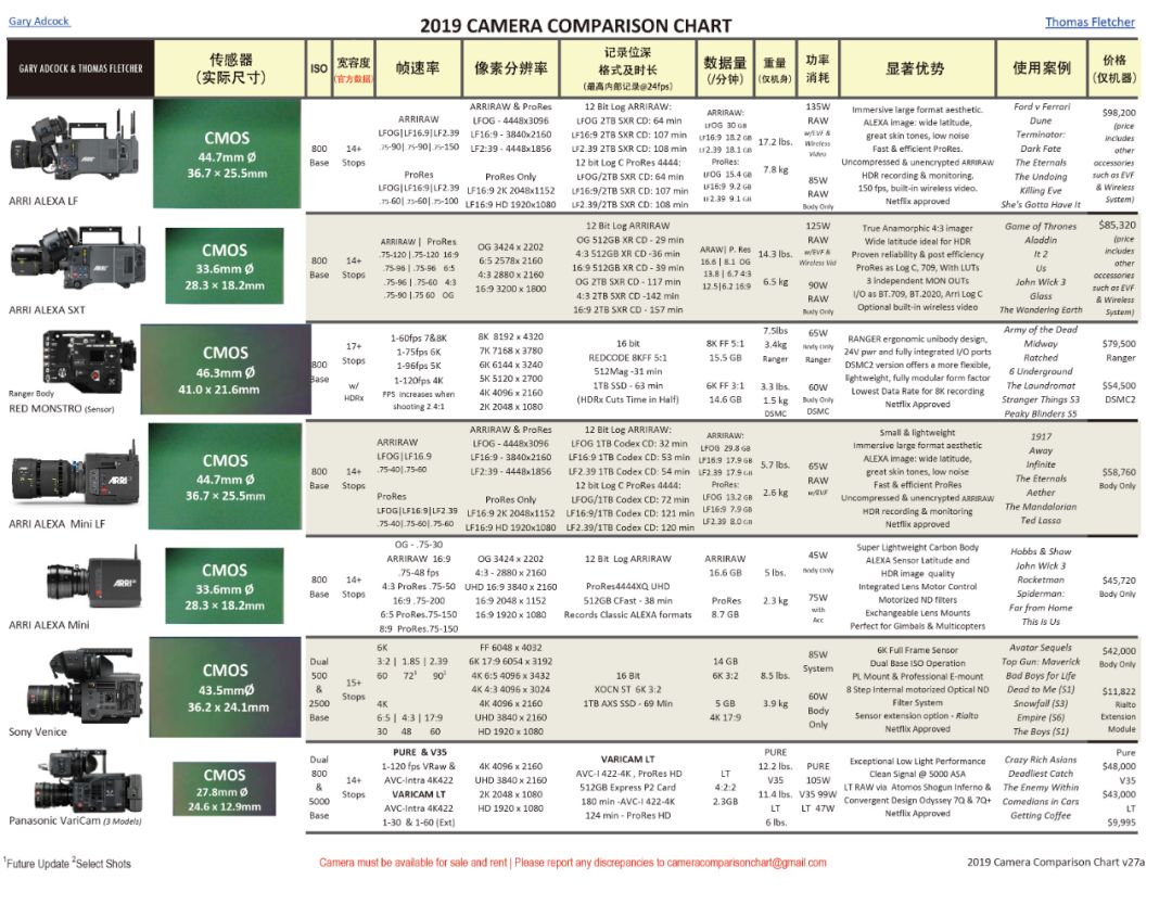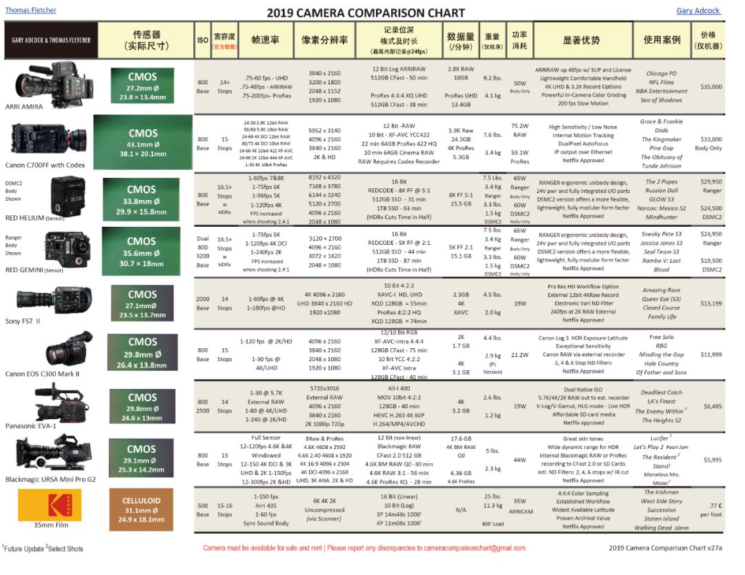 2007年以來,Fletcher每年都會制作一張攝影機的參數對比圖,每張都由技術顧問Adcock協助完成,其他電影攝影師也會對信息進行額外補充(包括ASC成員Robert Primes,David Stump,Bill Bennett)。2017年,Adcock接管成為主要聯系人和制作人。