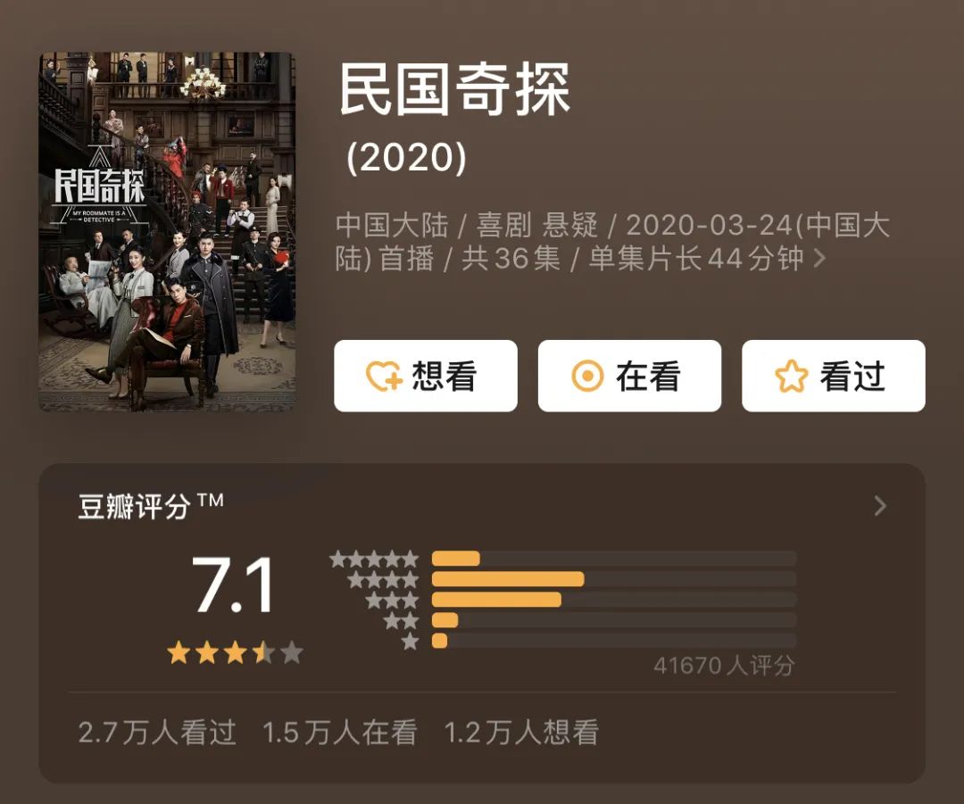 在這當中,剛剛收官的《民國奇探》卻表現得頗為搶眼:愛奇藝站內最高熱度值高達7810,多次榮登Vlinkage、貓眼全網熱度榜榜首,微博話題#民國奇探# 閱讀量高達19.1億,討論度328.8萬,除此之外,豆瓣7.1的高評分也讓人很是驚喜。那么,作為一部探案劇,《民國奇探》到底做了何種突破,讓該類型劇的生命力得以延續?