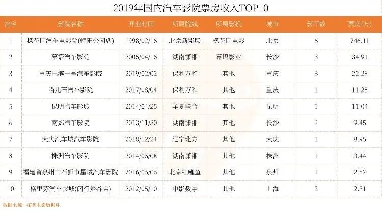 中國第一家汽車影院是成立于1997年的北京楓花園汽車電影院,也是中國營業狀況最好的一家汽車影院。根據拓普電影數據庫統計,截至2019年底,全國有票房產出的汽車影院共28家,僅占全國影院數量的0.24%。汽車影院的票房收入也不甚理想,除北京楓花園汽車電影院年票房到了746.11萬元外,其余汽車影院年票房產出均不足40萬元,甚至有23家汽車影院年票房收入不足10萬元。相比之下,去年全國電影票房達到了641.5億元,排名第一的北京耀萊成龍影城(五棵松店)單店年票房達到了7504.8萬元。