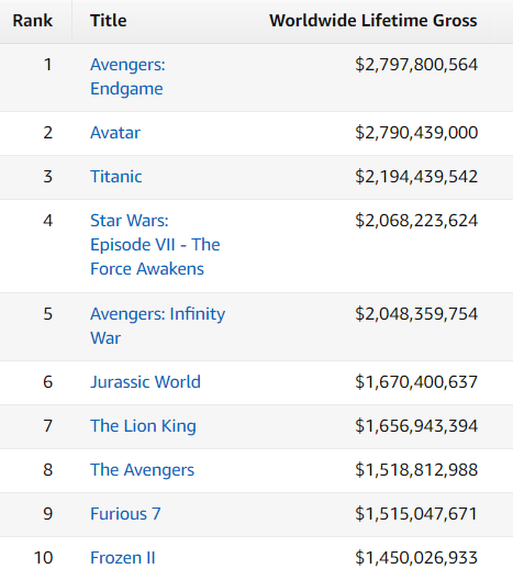 全球影史票房榜,前三為《復聯4》《阿凡達》《泰坦尼克號》
