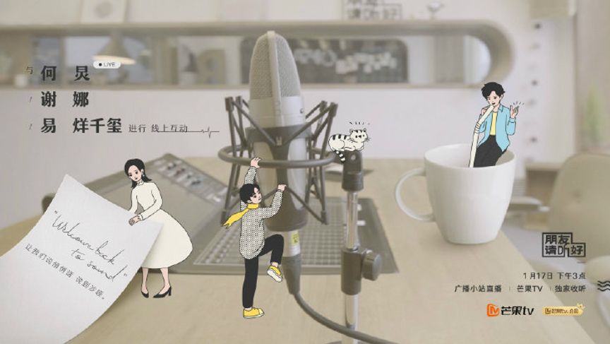 《朋友請聽好》的創新之處不僅在于以聲音作為媒介,節目在整體設置上也令人耳目一新,分為直播互動和真人秀兩階段,直播于1月2日開始,真人秀部分則于2月19日起于每周三中午12點在芒果TV上線。