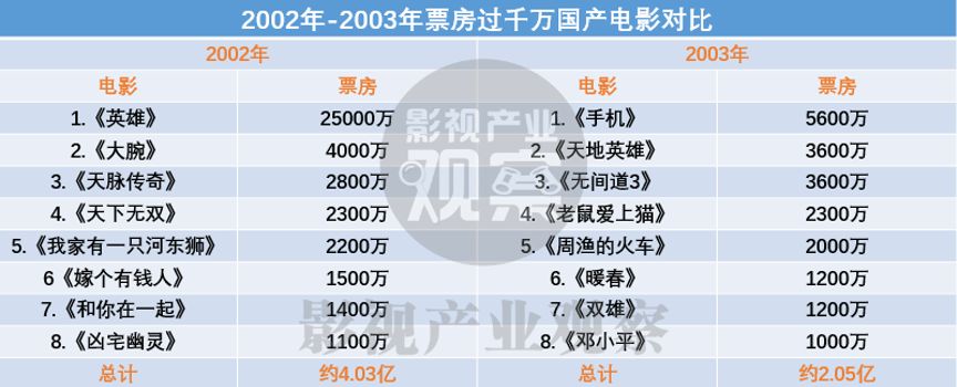 2003年非典疫情之前,中國電影市場化之路正處于起步的關鍵階段,本呈現(xiàn)向好態(tài)勢的電影市場,卻因非典疫情的突然爆發(fā)而得到重創(chuàng)。在2003年,國產片(包含內地香港合拍片)票房超過1000萬元的影片數(shù)量為8部,這一數(shù)字與上一年基本持平。但在票房總量上,2002年票房過千萬的國產電影所貢獻的票房總量為4.03億,而受非典影響,2003年票房過千萬的8部國產片貢獻總量僅有2.05億,在這其中超過25%的票房貢獻都來自于2003年12月底上映的《手機》。一個更直觀的數(shù)據是,當時身處非典疫情重災區(qū)的廣州,在疫情期間的年度總票房比2002年下降了50%,而廣州省歷來是全國最大票倉。