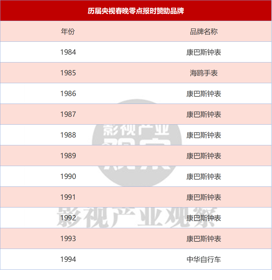 其中,康巴斯鐘表絕對是當(dāng)時(shí)的霸主。除了1985年和1994年兩屆春晚的冠名權(quán)被易主到海鷗手表和中華自行車上,康巴斯鐘表曾8次在大年初一的零點(diǎn)時(shí)刻給全國的觀眾們報(bào)時(shí)。在春晚巨大傳播影響力的驅(qū)動(dòng)下,康巴斯鐘表廠也迅速崛起成為了鐘表領(lǐng)域的龍頭企業(yè),1992年時(shí)年產(chǎn)量從1985年的45萬只躍升至200萬只以上。但隨著1994年康巴斯開始陷入長達(dá) 6 年的商標(biāo)大戰(zhàn),它的身影在春晚舞臺(tái)上徹底消失。