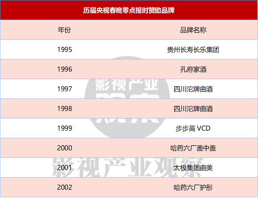 到了90年代中期,春晚的零點(diǎn)贊助商開始向酒企和藥企轉(zhuǎn)變。1995年,價(jià)格在當(dāng)時(shí)甚至高于茅臺(tái)的貴州長壽長樂集團(tuán)成為央視春晚零點(diǎn)倒計(jì)時(shí)廣告的競標(biāo)得主,正式拉開了白酒廣告大戰(zhàn)的帷幕。之后,隨著山東酒業(yè)和四川酒業(yè)在中國市場地位的不斷輪替,以孔府家酒和沱牌曲酒為代表的頭部酒類品牌也都曾在春晚中豪擲重金為自己打過廣告。