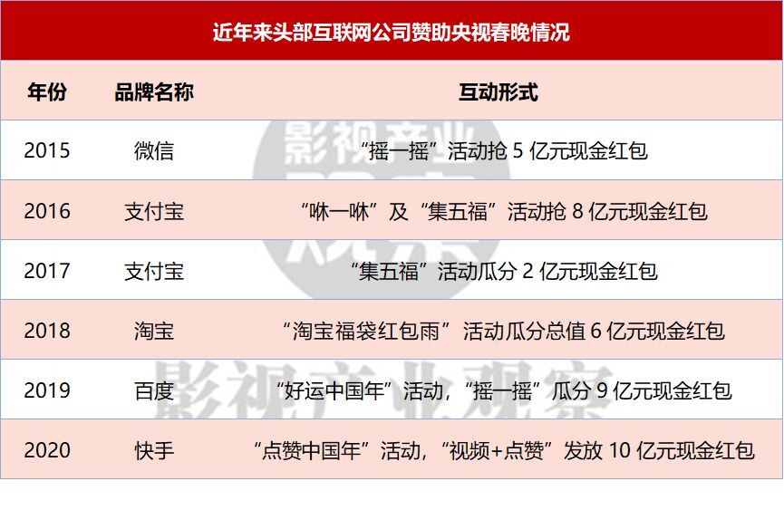 隨著互聯(lián)網(wǎng)在全球的不斷發(fā)展,以BAT為代表的互聯(lián)網(wǎng)企業(yè)在中國崛起。對于他們來說,用戶數(shù)量是最為核心的競爭力,覆蓋范圍最廣的央視春晚自然成為各大互聯(lián)網(wǎng)企業(yè)爭相搶奪的流量高地。從2015年春晚開始,不僅晚會(huì)前十分鐘的廣告“黃金時(shí)段”易主,唯品會(huì)、滴滴專車、快的打車、趕集網(wǎng)、微店、小米、樂視等互聯(lián)網(wǎng)公司輪番上陣,代替了原來的蒙牛、伊利、雪花啤酒等快消品品牌。對于更強(qiáng)調(diào)社交屬性的各大互聯(lián)網(wǎng)巨頭來說,他們對“官方互動(dòng)合作伙伴”這一贊助商身份的爭奪更是頗為激烈。