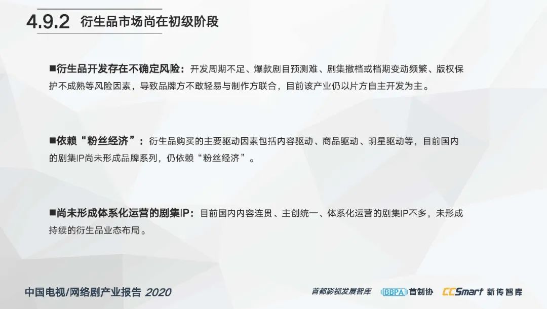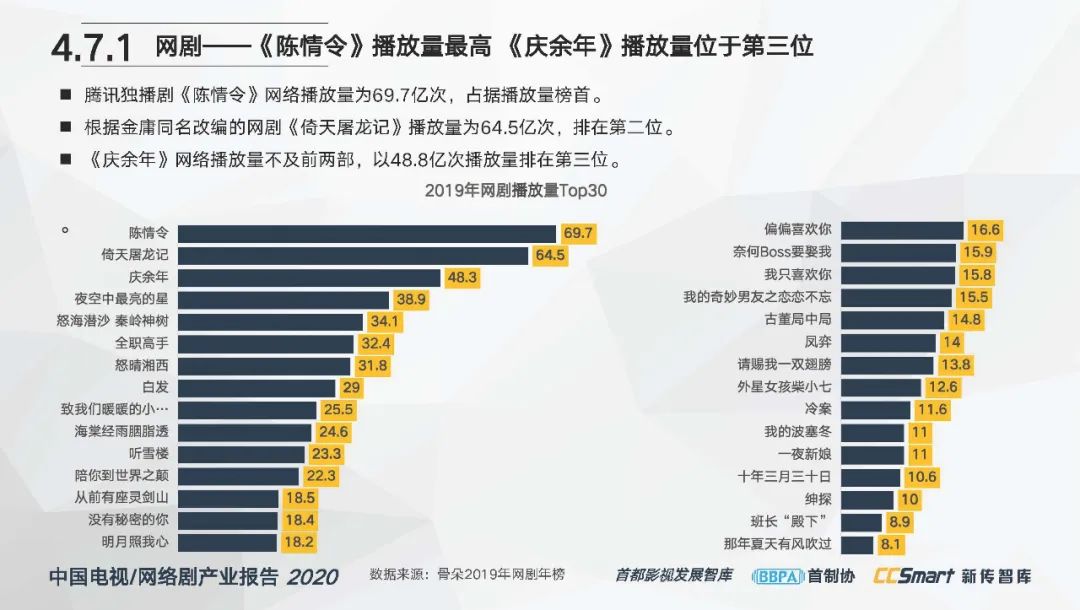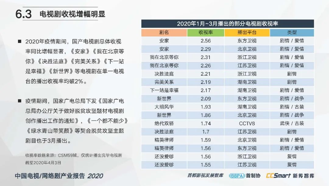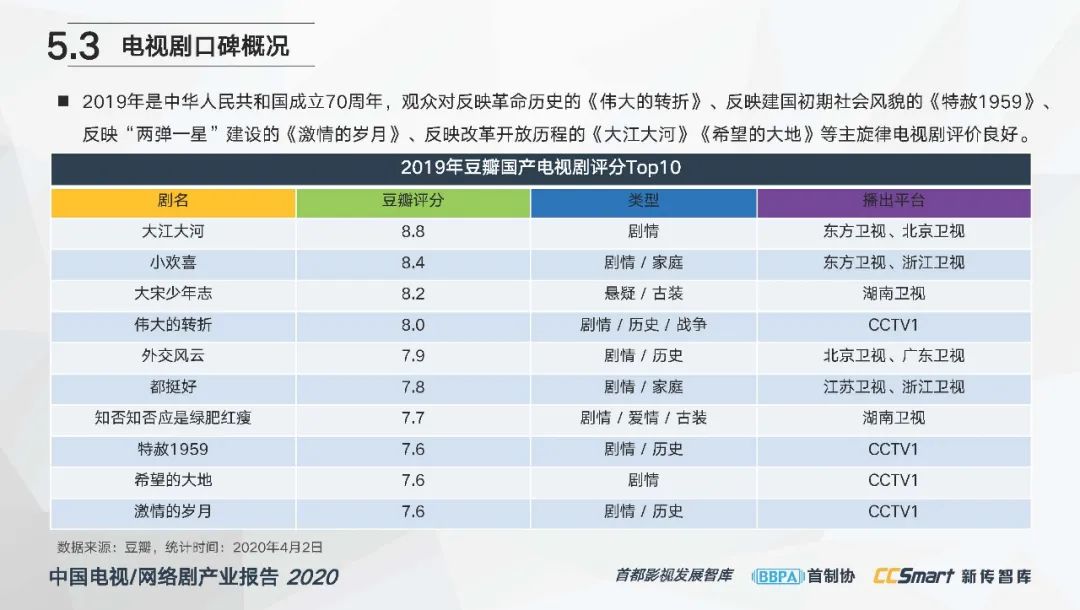 第26屆北京電視節目交易會(2020春季)成功召開,由首都影視發展智庫、首都廣播電視節目制作協會、清華大學中國文藝評論基地、CC-Smart新傳智庫聯合出品的《中國電視/網絡劇產業報告(2020)》也隨之發布。《報告》從7個維度對2019年電視劇/網絡劇行業復盤、對2020年電視劇/網絡劇發展方向和行業熱點進行了深度解讀。