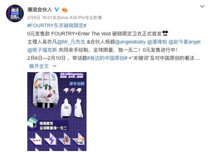 圍繞著“破曉限定夜”,節(jié)目還展開了線上福利回饋活動,登陸愛奇藝APP或轉(zhuǎn)發(fā)微博,都有機會0元抽取破曉限定衛(wèi)衣。同時,節(jié)目組還將FOURTRY潮流集合店的部分營業(yè)額購買一萬個醫(yī)用外科口罩捐贈湖北省黃岡市黃州區(qū)東湖街道辦事處長圻廖社區(qū),并致敬前線工作人員,鼓舞共同抗疫。