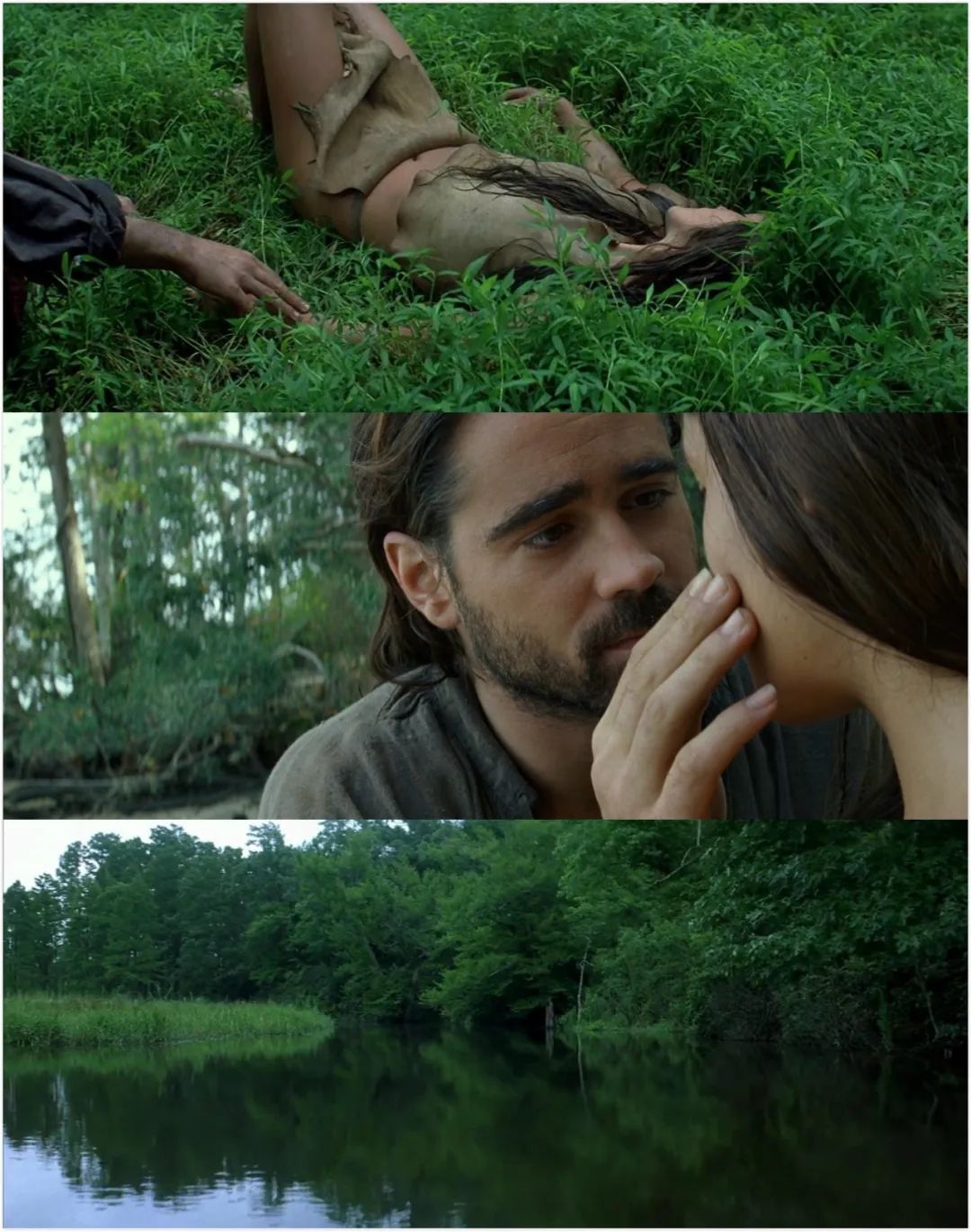 在一組近似于精神性愛的鏡頭之后,一組交切鏡頭展現了詹姆士河和四周的森林:鳥兒在森林中飛舞,靜靜流淌的河水被漂浮的小種子點綴著,草叢長到了人的腰部,陰沉的天空開始下起雨來,天空雖然陰沉但并不壓抑,雨滴也是清新的。柔和的水浪拍打著詹姆士河的河岸,而那正是波卡洪塔斯和史密斯的嬉戲地。