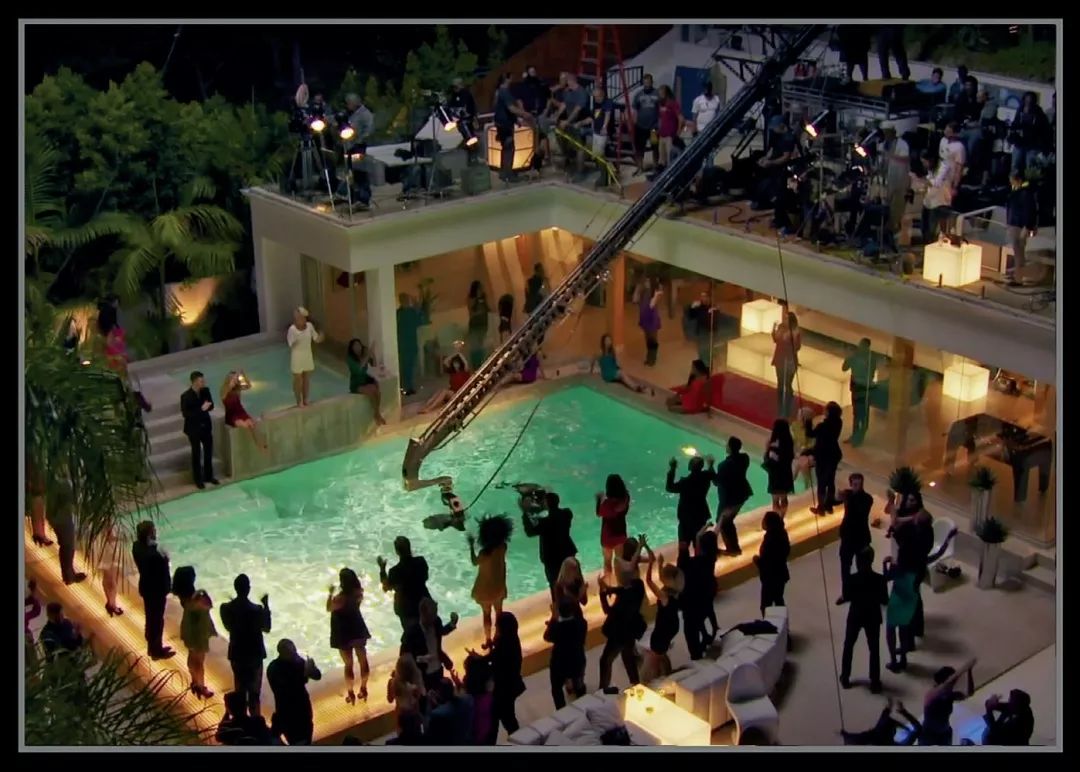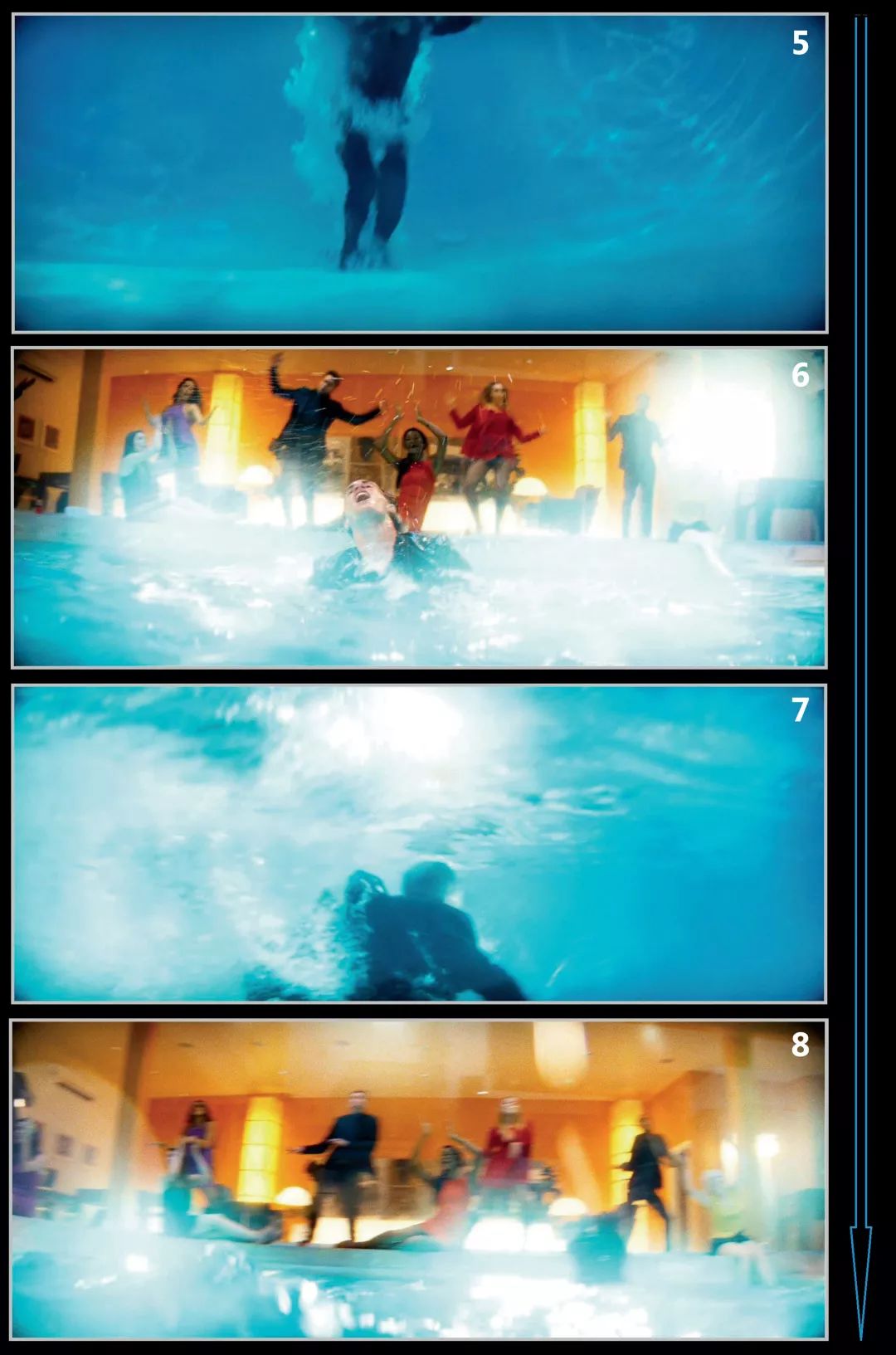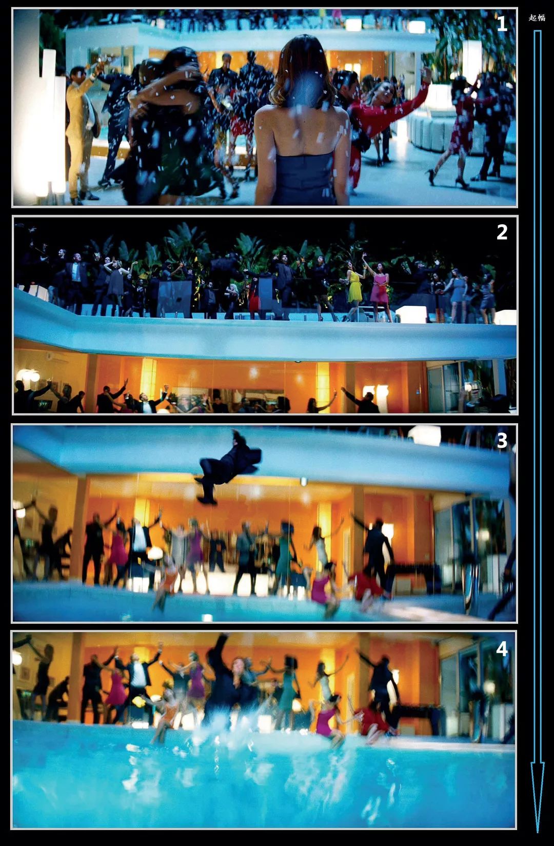視頻里所展示的攝影機入水鏡頭就是一個充滿視覺快感的長鏡頭。鏡頭開始跟隨女主角米婭(艾瑪·斯通飾)來到派對場所游泳池邊(畫1),這時看到對面房屋頂上坐滿的人群中跳下一個人物直入游泳池(畫2、3、4)。