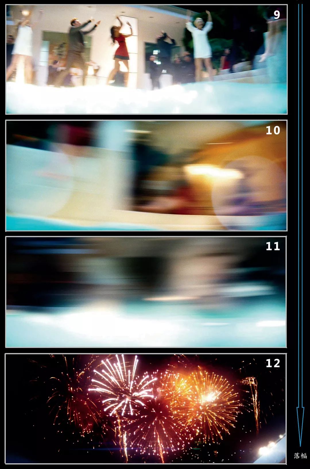 攝影機旋轉速度越來越快,具象消失,只見色彩光流(畫9、10、11)。攝影機旋轉了五圈之后,在高昂激烈的節奏中突出升起,黑暗的天空中爆發彩色繽紛的火花。