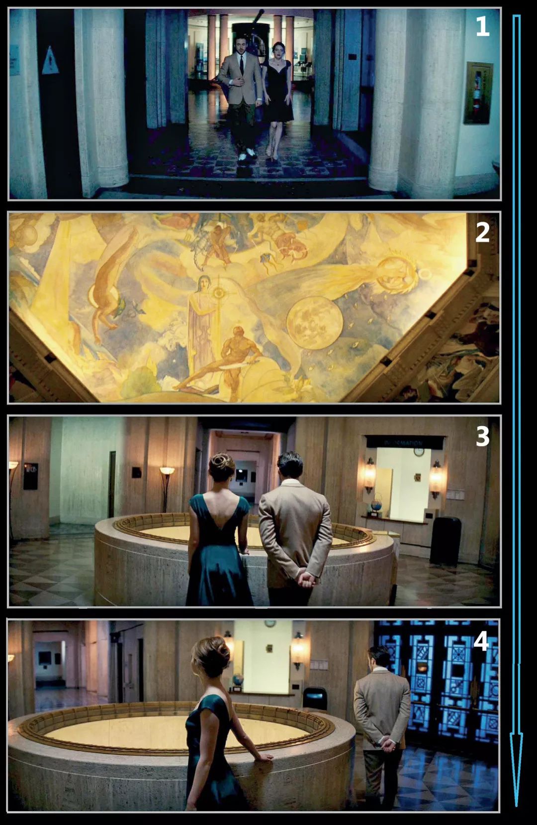 攝影機垂直旋轉180 度,瀏覽了天國,向下搖攝,這時二人背對鏡頭走到“傅科擺”圓形池邊。