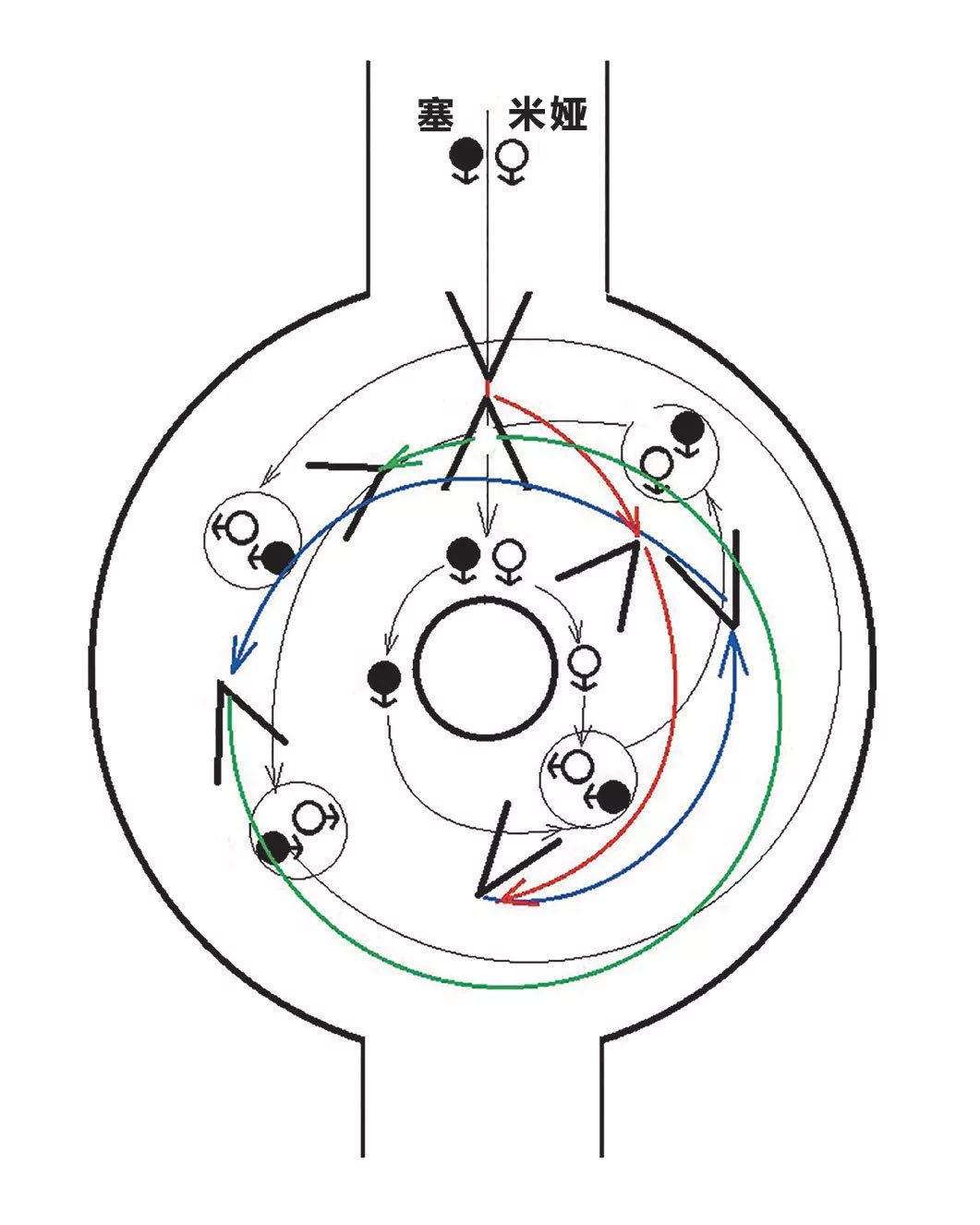 二人來時手挽手親密不可分,去時圍繞池口一左一右分開,分與不分又是對立。這些都是對影片第四部分“冬天”主題的暗示。