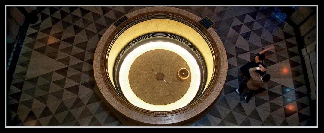 導演怕觀眾不明白他的表意,特地在后面接一個“傅科擺”鏡頭。這個鏡頭在線條構成上很有趣,圓圈一個套一個,最后一個小圓圈(擺),卻并非沿著弧線滾動,而是走自己的直線。